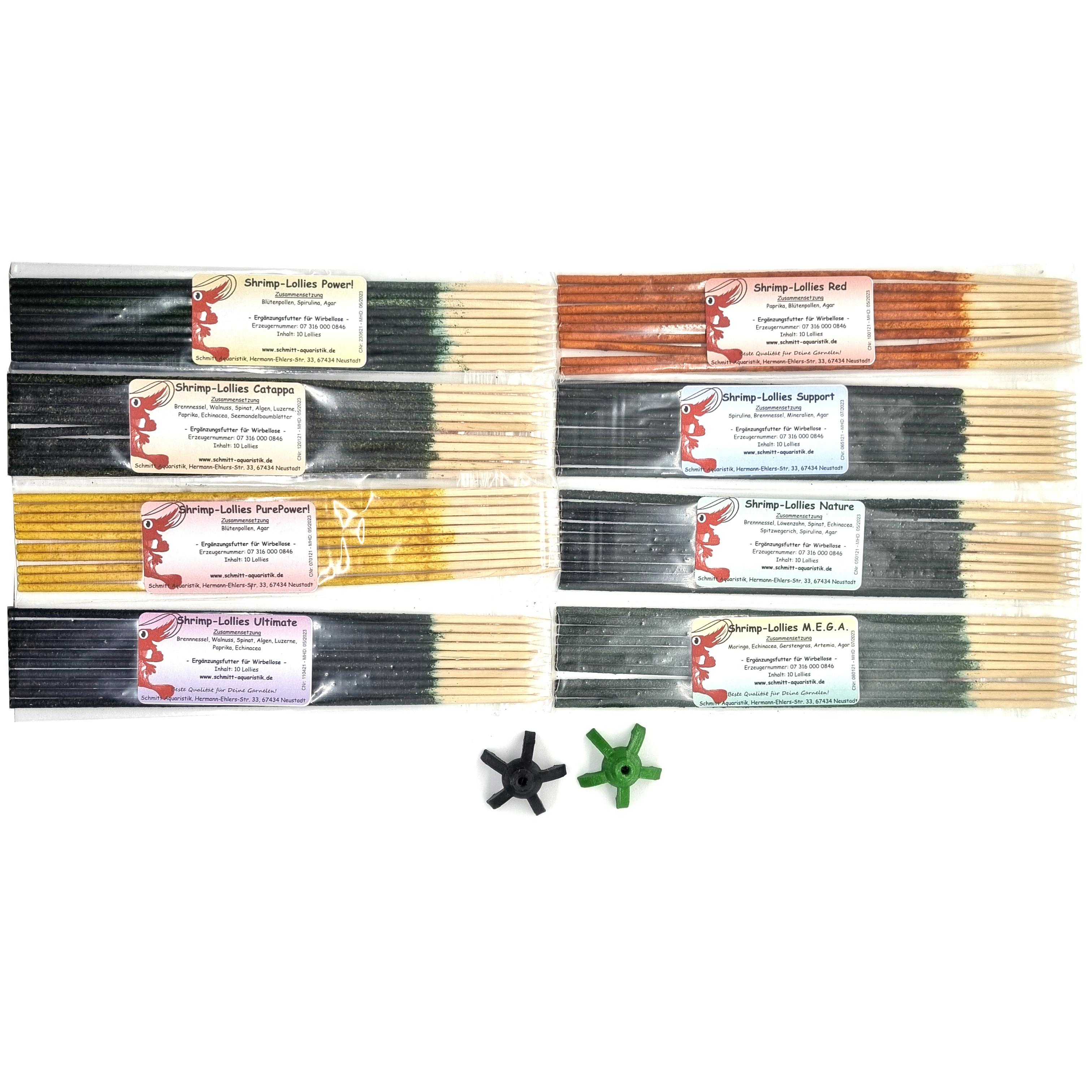 • Eine Packung Shrimp-Lollies Nature • Eine Packung Shrimp-Lollies Support • Eine Packung Shrimp-Lollies Power! • Eine Packung Shrimp-Lollies Ultimate • Eine Packung Shrimp-Lollies Red • Eine Packung Shrimp-Lollies M.E.G.A. • Eine Packung Shrimp-Lollies PurePower! • Eine Packung Shrimp-Lollies Catappa • zwei Stück Shrimp-Lollies-Halter (ausführliche Infos unter den jeweiligen Links)