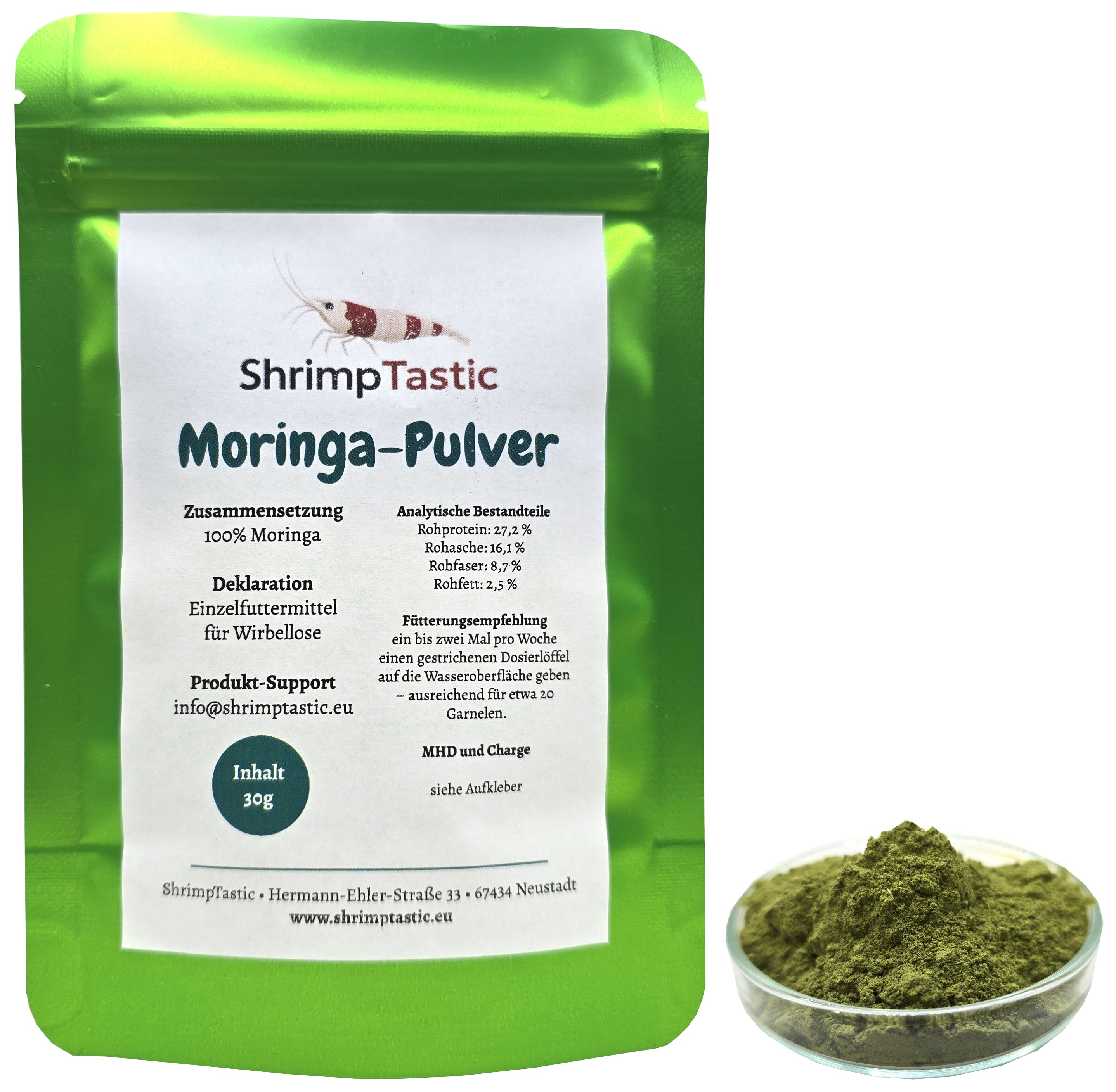 Die Blätter des Moringa-Baumes enthalten eine außergewöhnlich hohe Dichte an Vitaminen, Mineralstoffen und Proteinen. Das ultrafeine Pulver verteilt sich gleichmäßig im Aquarium und bildet einen nährstoffreichen Futterfilm, von dem sowohl Jungtiere als auch adulte Garnelen profitieren.