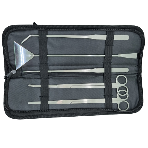• Pinzette (gerade), ~27cm • Pinzette (gebogen), ~27cm • Schere (gerade), ~25cm • Schere (gebogen), ~25cm • Spatel, ~32cm • Tasche